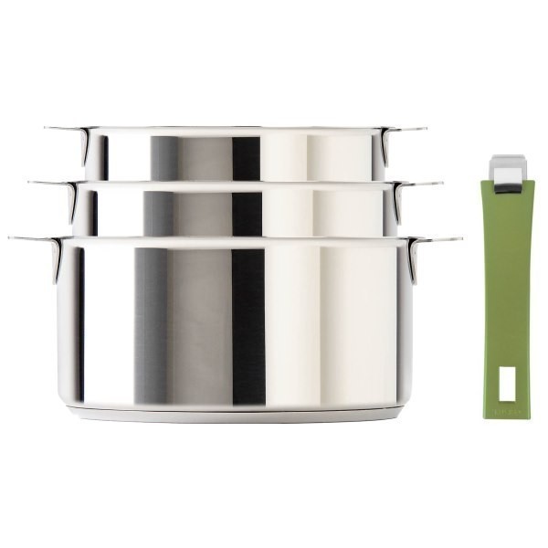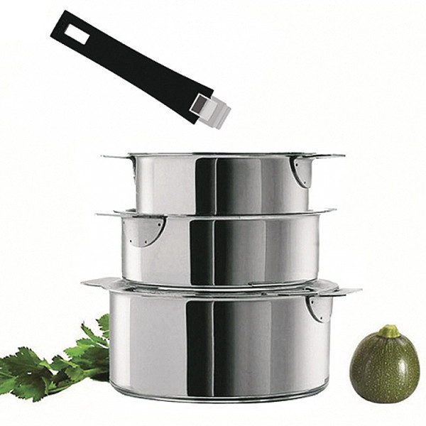 Le Set est composé de 3 casseroles inox 18/10, finition brillant miroir et d'une poignée amovible de la collection Mutine en Couleur.