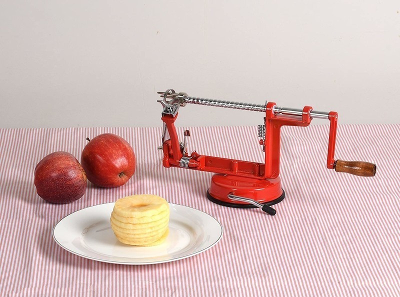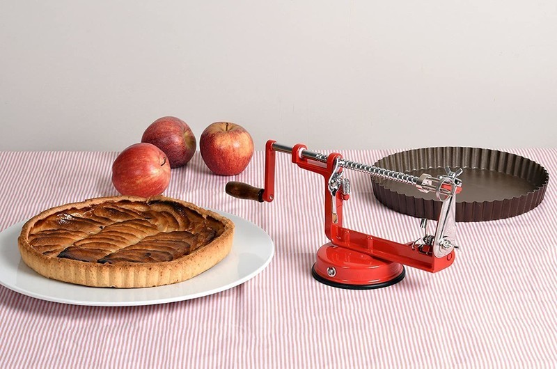 Pelez, évidez, tranchez et coupez vos pommes ou poires en quelques tours avec ce pèle-pomme CHEFS&CO au design vintage.